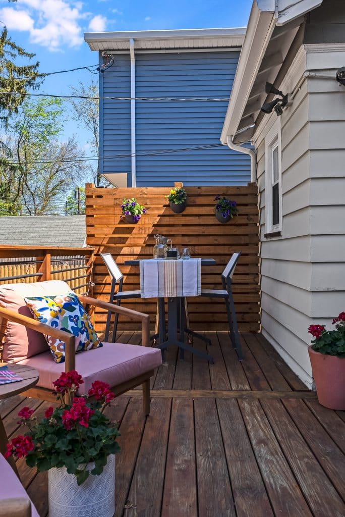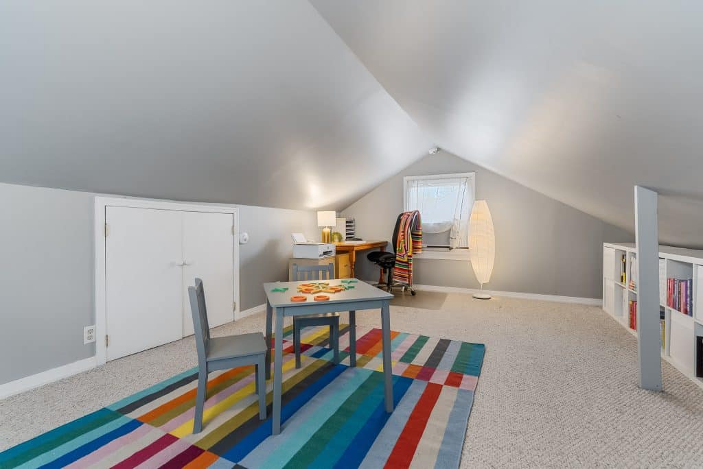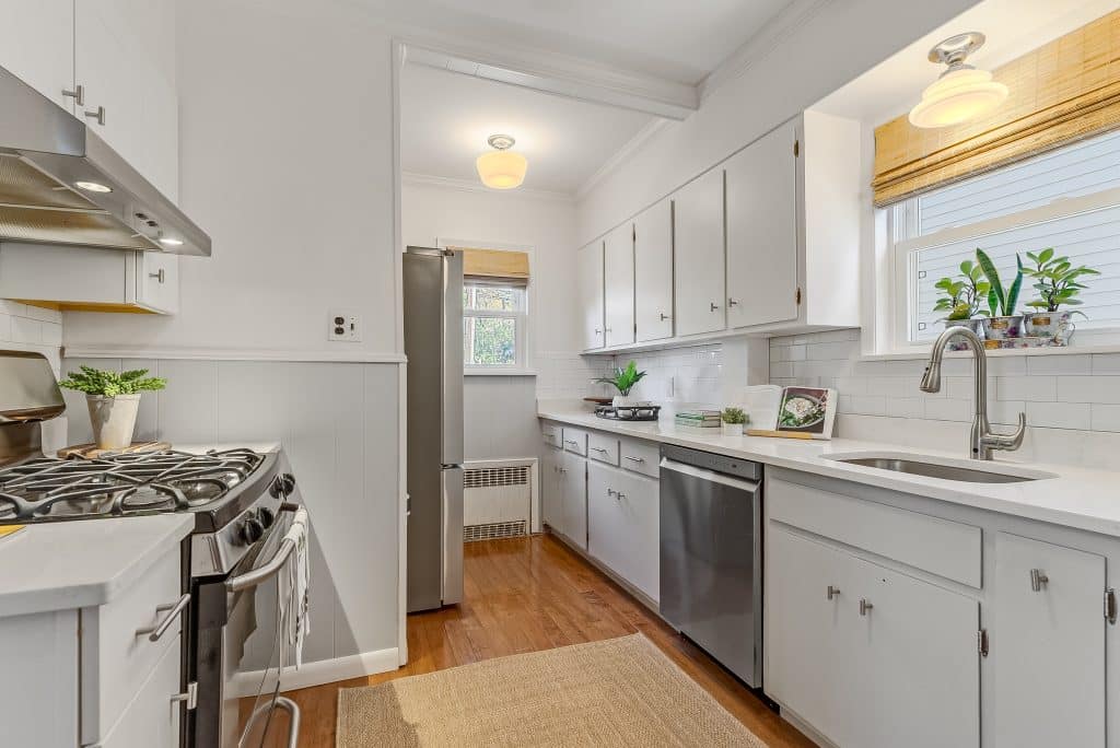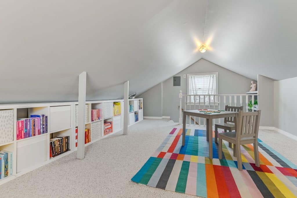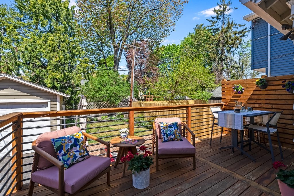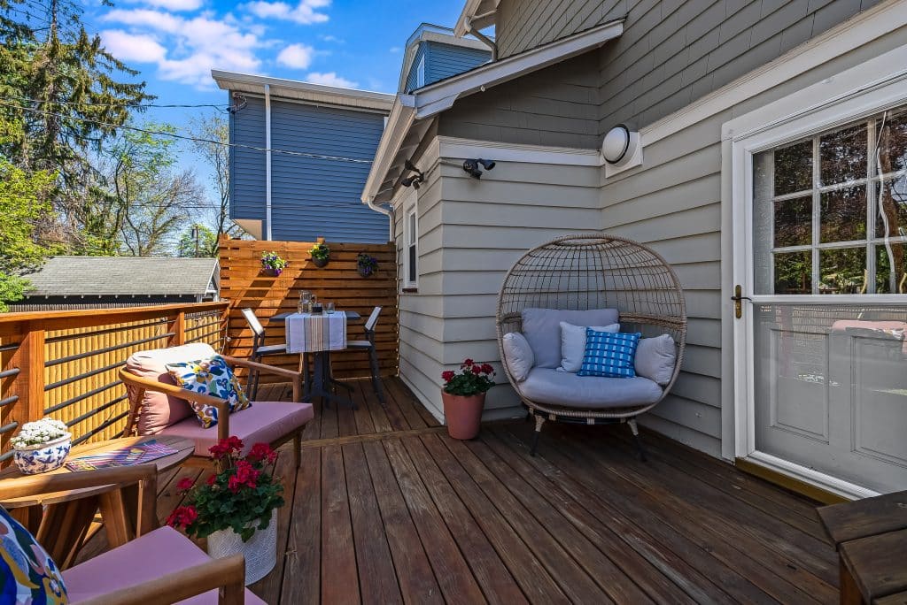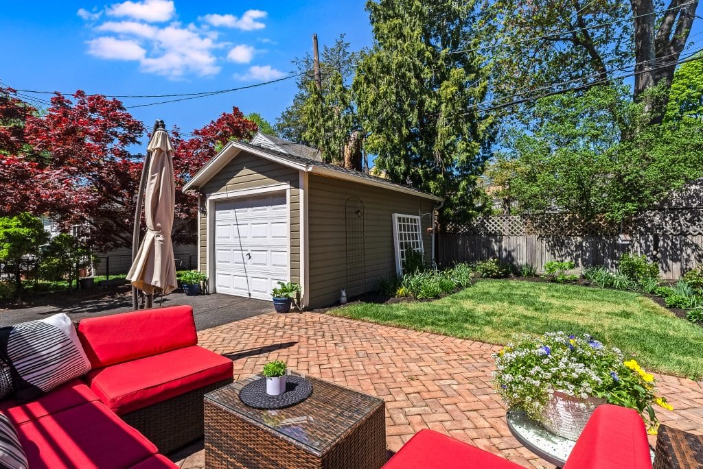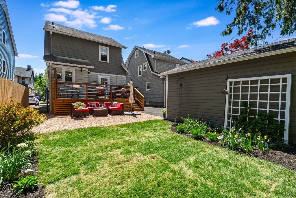 The backyard transformation has been particularly rewarding. What was once part asphalt and part mulch pile is now a vibrant garden with a brick patio and refurbished deck. The kitchen window serves as a convenient pass-through to the outdoor dining area. The back garden blooms with pink, magenta and white peonies in mid-May, features an oak leaf hydrangea at the center (it should really bloom this summer, it’s 3rd year) and a climbing hydrangea on the garage trellis. In the front, we’ve trained a climbing ‘New Dawn’ rose to grow up in front of the porch along wires – the flowers bloom twice and smell lovely. At the center stands a majestic rhododendron that’s at least 25 years old and continues to produce gorgeous purple flowers each season. Throughout the year, you’ll enjoy daffodils, tulips, and many other plantings in the front and back that provide continuous interest.